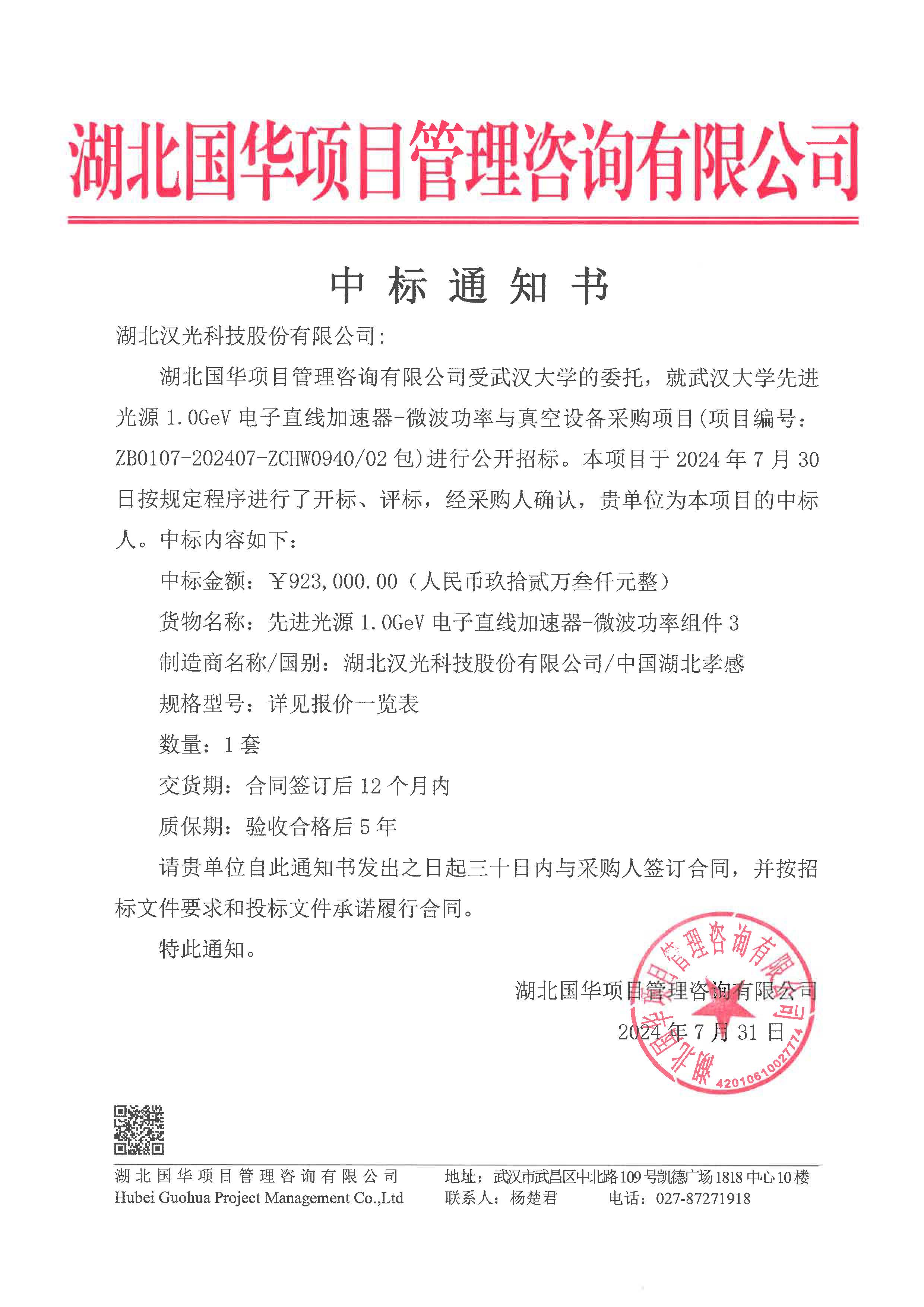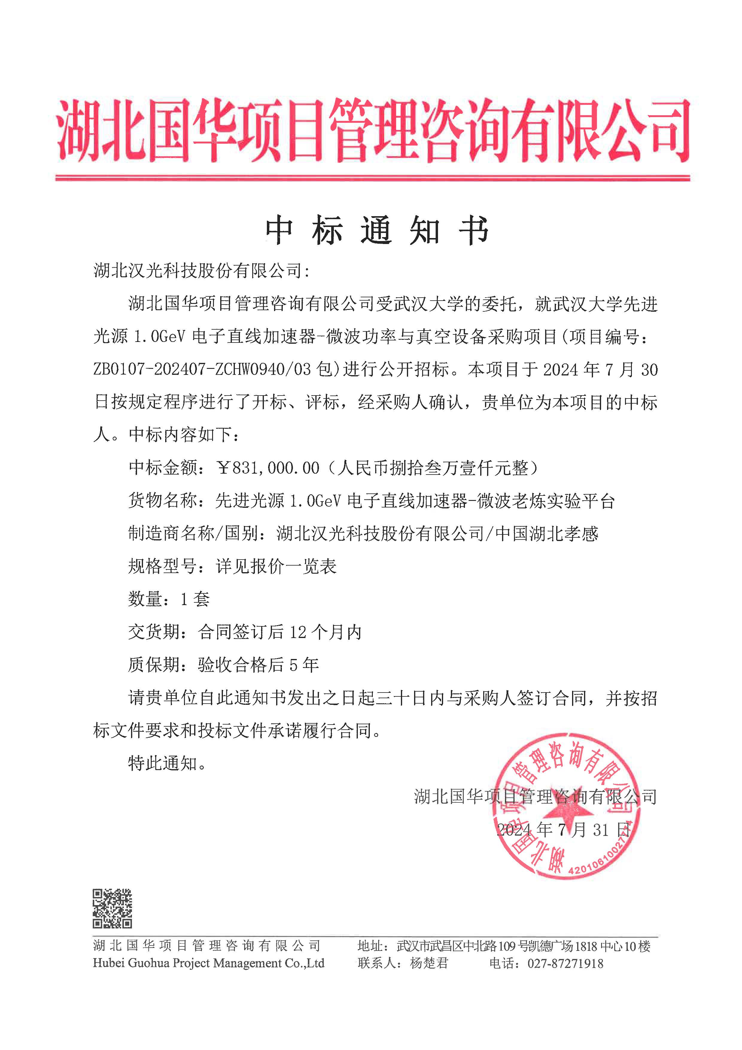 7月31日,公司收到湖北國(guó)華項(xiàng)目管理有限公司的中標(biāo)通知,公司自主研制的微波老煉實(shí)驗(yàn)平臺(tái)、波導(dǎo)功率組件成功中標(biāo)武漢大學(xué)先進(jìn)光源1.0GeV電子直線加速器。中標(biāo)價(jià)格175萬(wàn)余元。