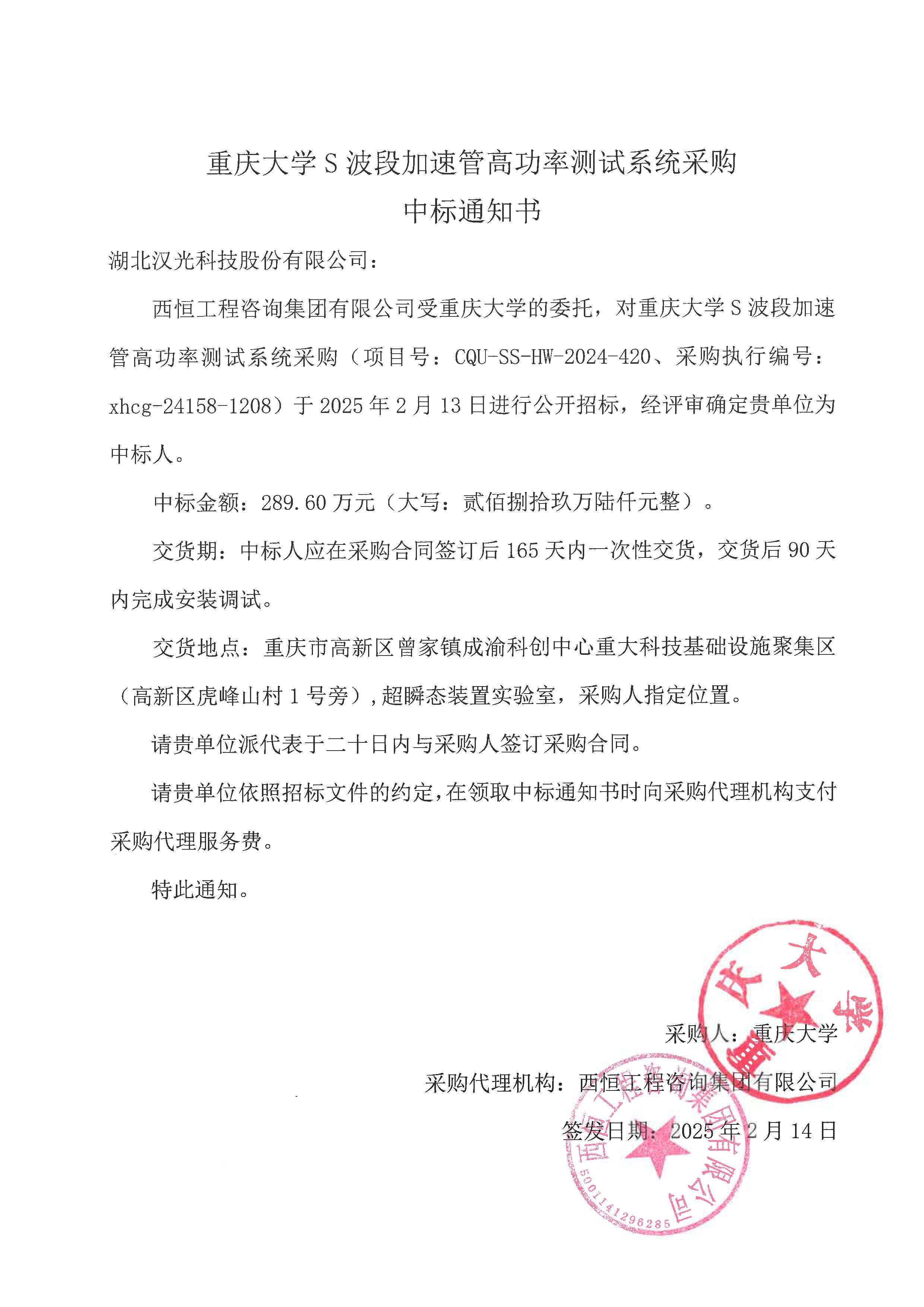 近日,公司收到重慶大學(xué)及其采購代理機(jī)構(gòu)發(fā)來的中標(biāo)通知書,公司成功中標(biāo)重慶大學(xué)S波段加速管高功率測試系統(tǒng),中標(biāo)金額289.6萬元。