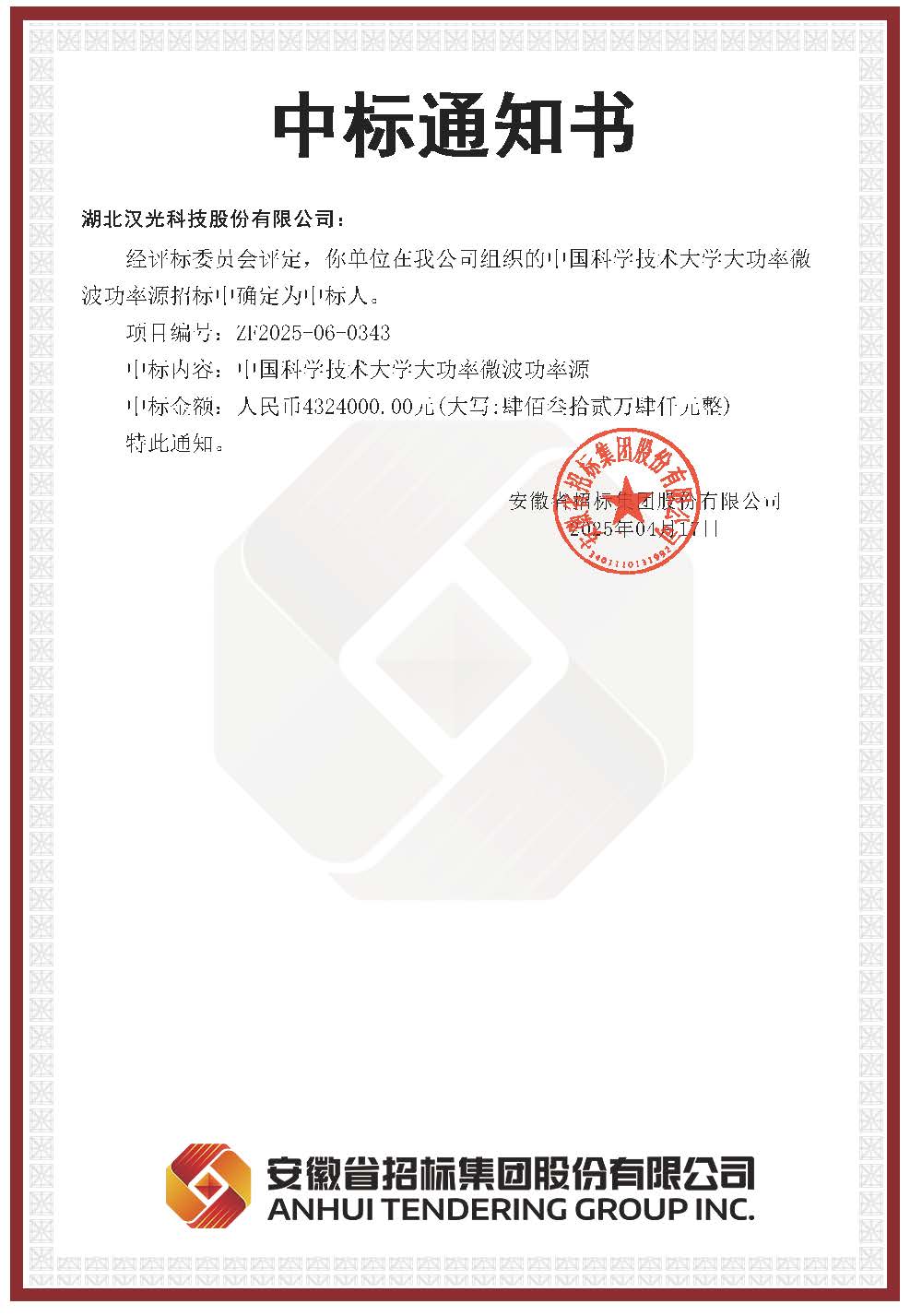 近日,公司收到安徽省招標(biāo)集團(tuán)股份有限公司發(fā)來的中標(biāo)通知書,公司成功中標(biāo)中國科學(xué)技術(shù)大學(xué)4套大功率微波功率源,中標(biāo)金額總計432.4萬元。