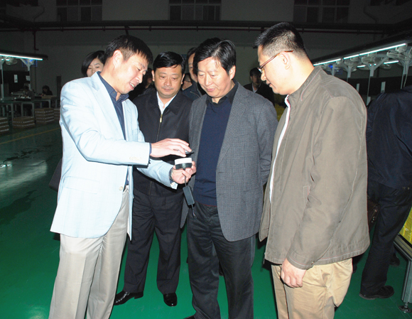 仇平貴聽取公司董事長梅祖軍(左1)LED照明產品的匯報。